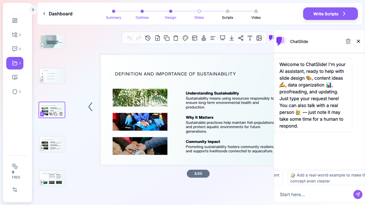 ChatSlide transforms research topics into structured, professional presentations that follow the conventions of scientific communication. Here is how it works for environmental science: