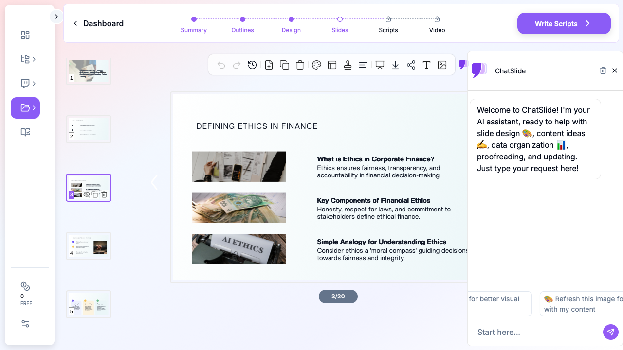 Building comprehensive finance ethics training no longer requires weeks of work. ChatSlide helps compliance teams generate structured, professional training presentations that cover complex regulatory requirements — giving you more time to focus on customization, scenario development, and actual training delivery.
