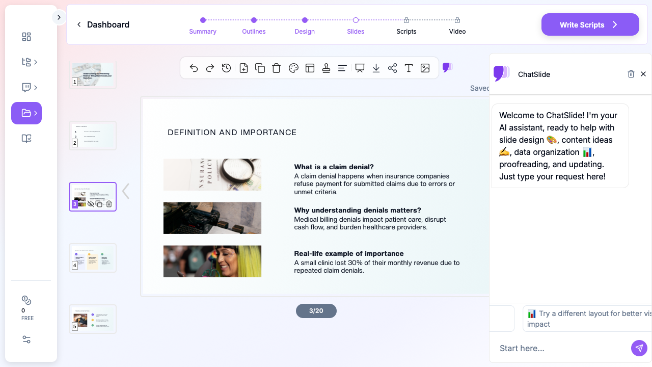 Visit ChatSlide to create your first medical billing presentation today.