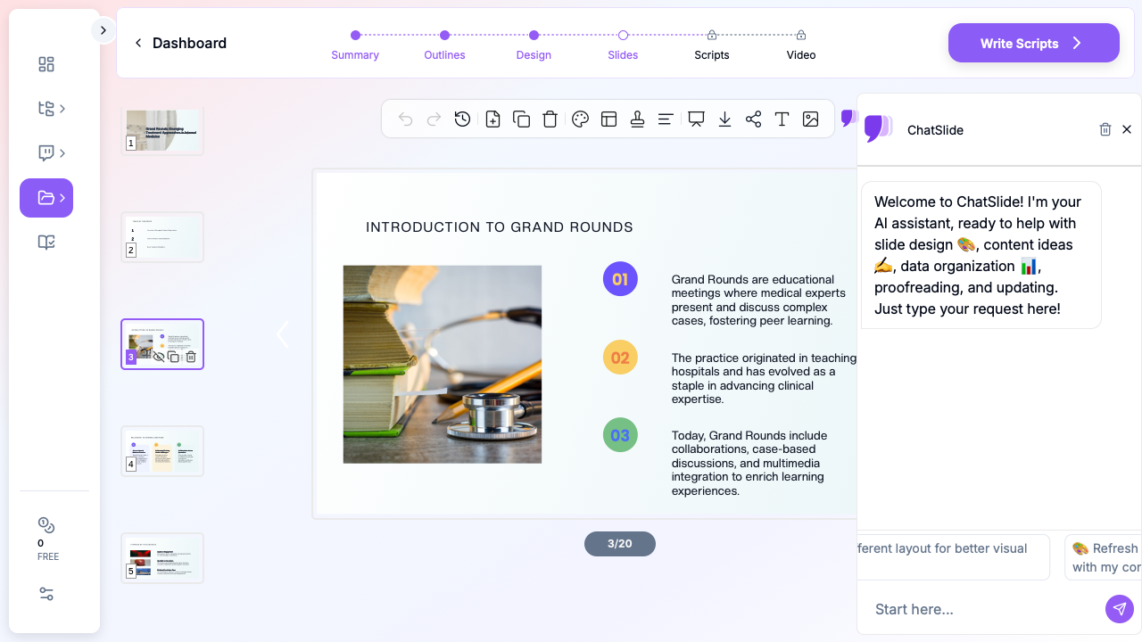 Hospital physicians, residents, and fellows are using ChatSlide to prepare grand rounds, journal clubs, and case conferences faster — with built-in access to PubMed, Google Scholar, and clinical trial data.