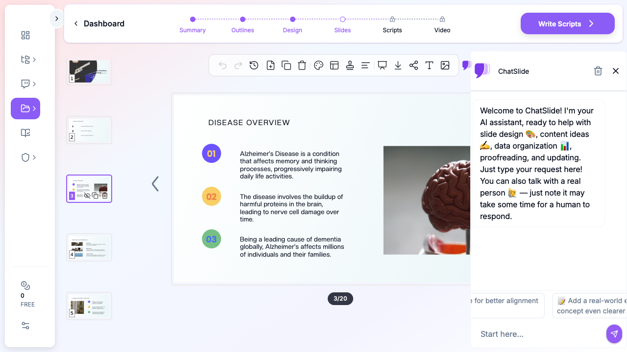 ChatSlide uses your topic to generate a structured outline that follows the logical progression of drug development: disease background, mechanism of action, preclinical evidence, clinical trial design, efficacy outcomes, and future directions.