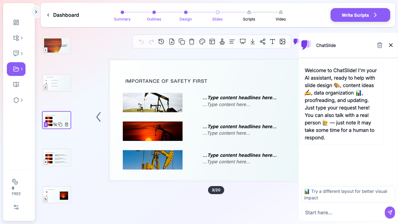 Upload your source document — an incident report, a procedure, a JSA, a regulatory update, or just a rough outline of what tomorrow's briefing should cover — and create your first oil and gas presentation at chatslide.ai. The first deck is free. If it saves the time of one rig-up, it's already paid for itself.