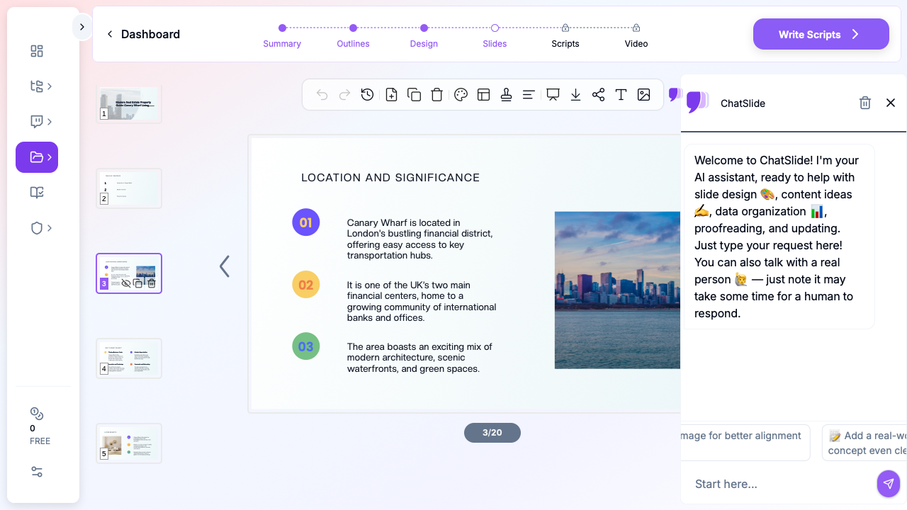 Start with your next listing or neighborhood guide. Enter your topic at app.chatslide.ai, customize the outline to reflect your local expertise, generate the slides, and add your own property photos and market data. The result is a presentation that looks like it came from a professional design team, produced in a fraction of the time.